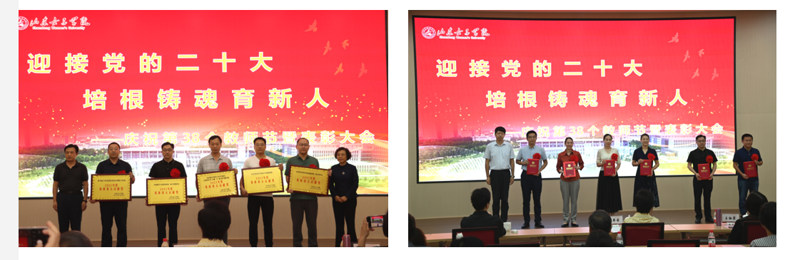 会上,对获得全国五一劳动奖章、山东省人民政府决策咨询奖、山东省泰山文艺奖、省级教学成果奖等国家和省级奖励的教师集体和个人、学校重大贡献奖获奖集体和个人、校级“最美教师”和教书育人楷模进行表彰,向从教30年教职工颁发了纪念品,新教师向老教师献花,老教师向新教师佩戴校徽,寓意着女院精神薪火不断、教书育人使命代代相传。获奖教师代表、新教师代表、青年学生代表分别致辞。青年学生献唱《春暖花开》,表达对学校美好明天的企盼。